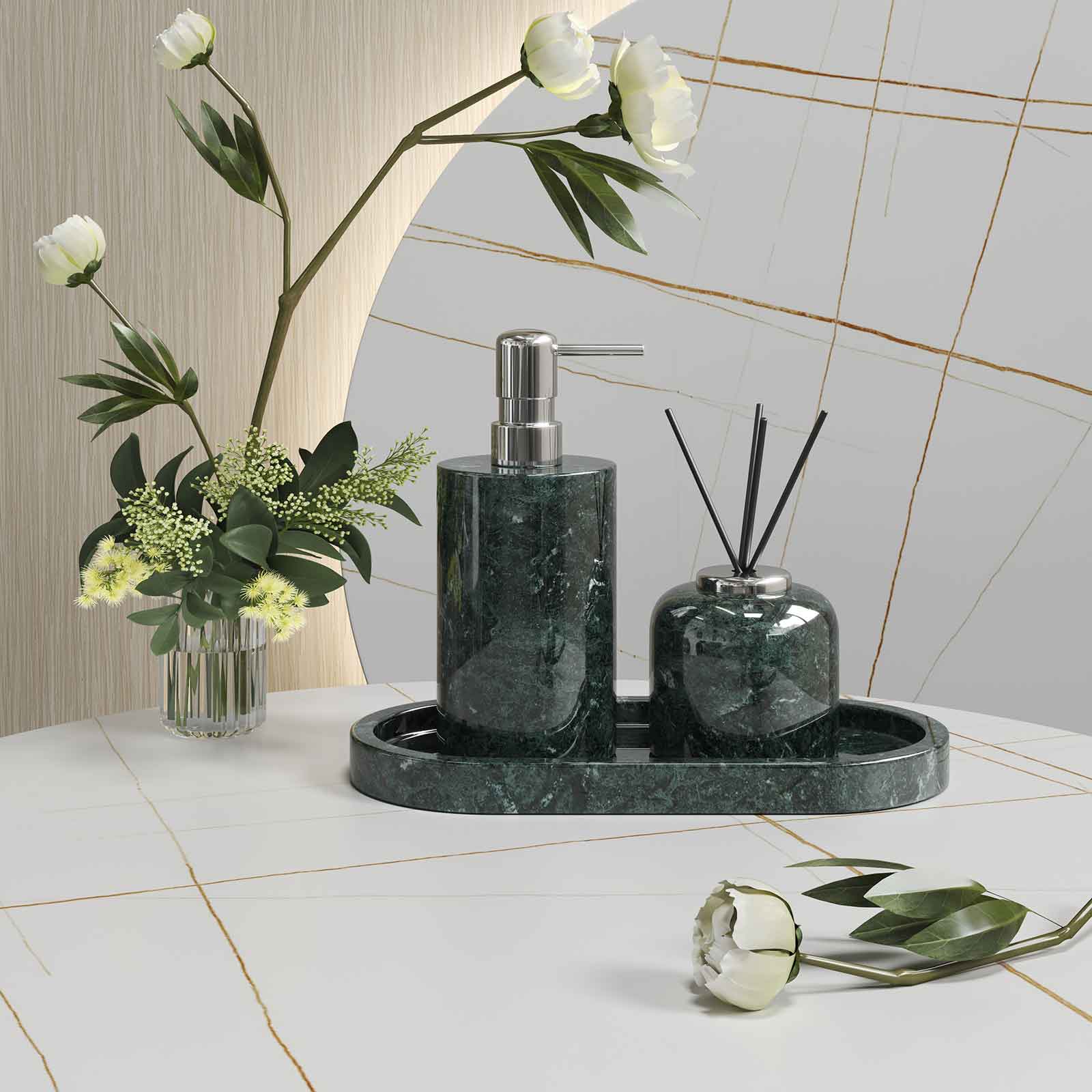 Luxury Light Jazz Green Marble Bathroom Suite, including Hand Sanitizer Bottle, Jewelry Storage Basket and Tray Set